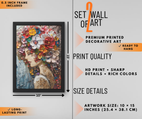 Abstract Woman Portrait & Floral Fantasy Wall Art Set of 2 | Luxury Artistic Wall Decor