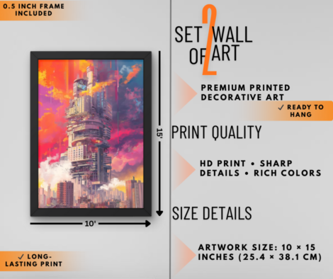 Abstract Geometric City & Futuristic Skyline Wall Art Set of 2 | Modern Tech Wall Decor