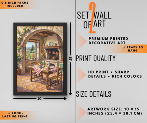 Vintage Mediterranean Kitchen & Coastal View Wall Art Set of 2 | Aesthetic Home Decor Frames