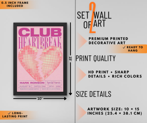 Club Heartbreak & Colorful Hearts Wall Art Set of 2 | Pop Art Aesthetic Wall Decor