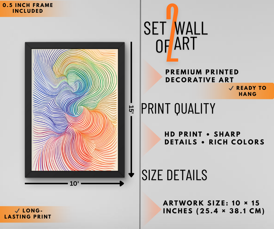 Add a modern artistic touch to your walls with this set of 2 colorful abstract swirl wall art frames. Featuring vibrant patterns and contemporary designs, these framed artworks are printed in HD quality for sharp details and rich colors. The 0.5 inch frame and ready-to-hang design make them perfect for living rooms, bedrooms, offices, or studio décor.