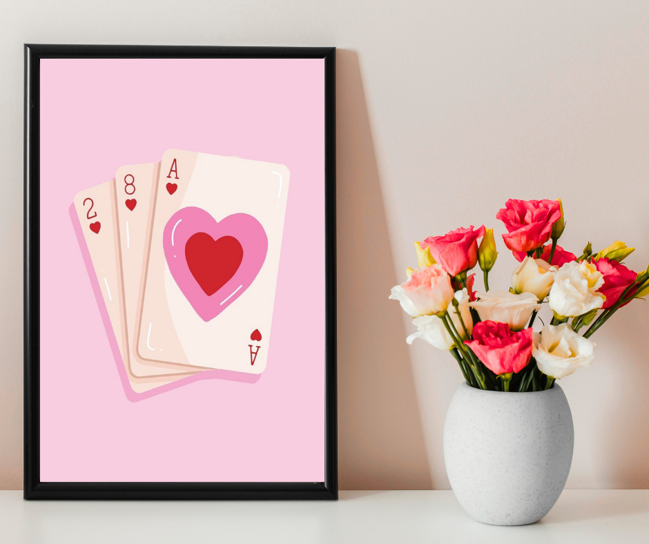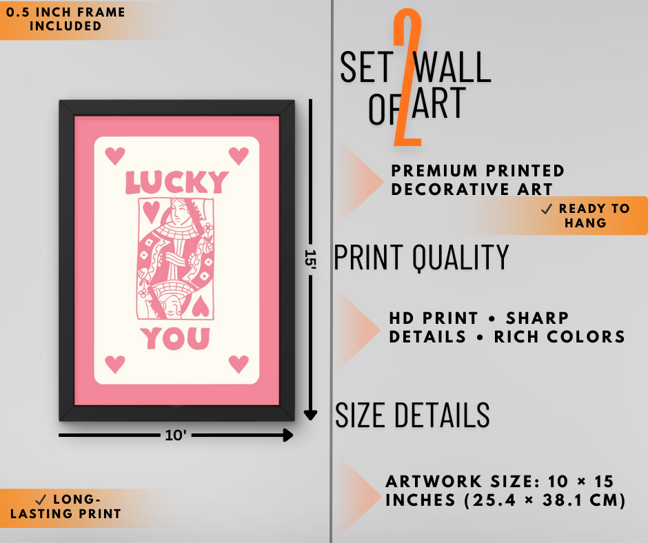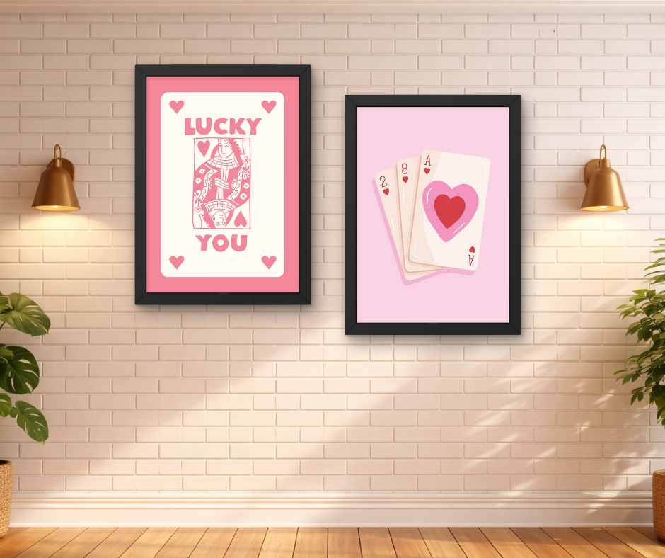 Bring fun and romance together with this playful love card wall art set, inspired by classic playing cards and heart-themed aesthetics. The unique combination of “Lucky You” typography and cute card illustrations creates a quirky yet romantic vibe for your space.
