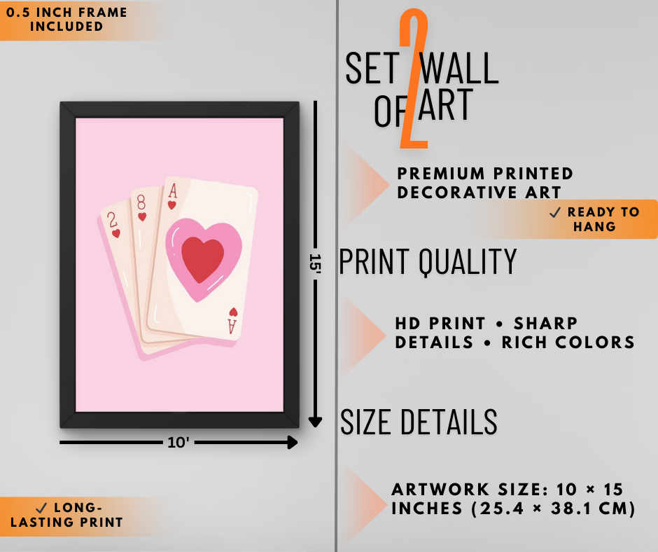 Add a playful romantic vibe to your space with this love card wall art set of 2. Featuring cute playing card and heart illustrations, these frames are printed in HD quality for a stylish and aesthetic look. Perfect for bedroom and couple décor.